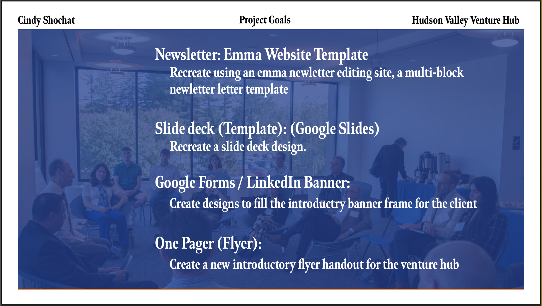 Worked for a semester with the venture hub to improve their marketing materials.