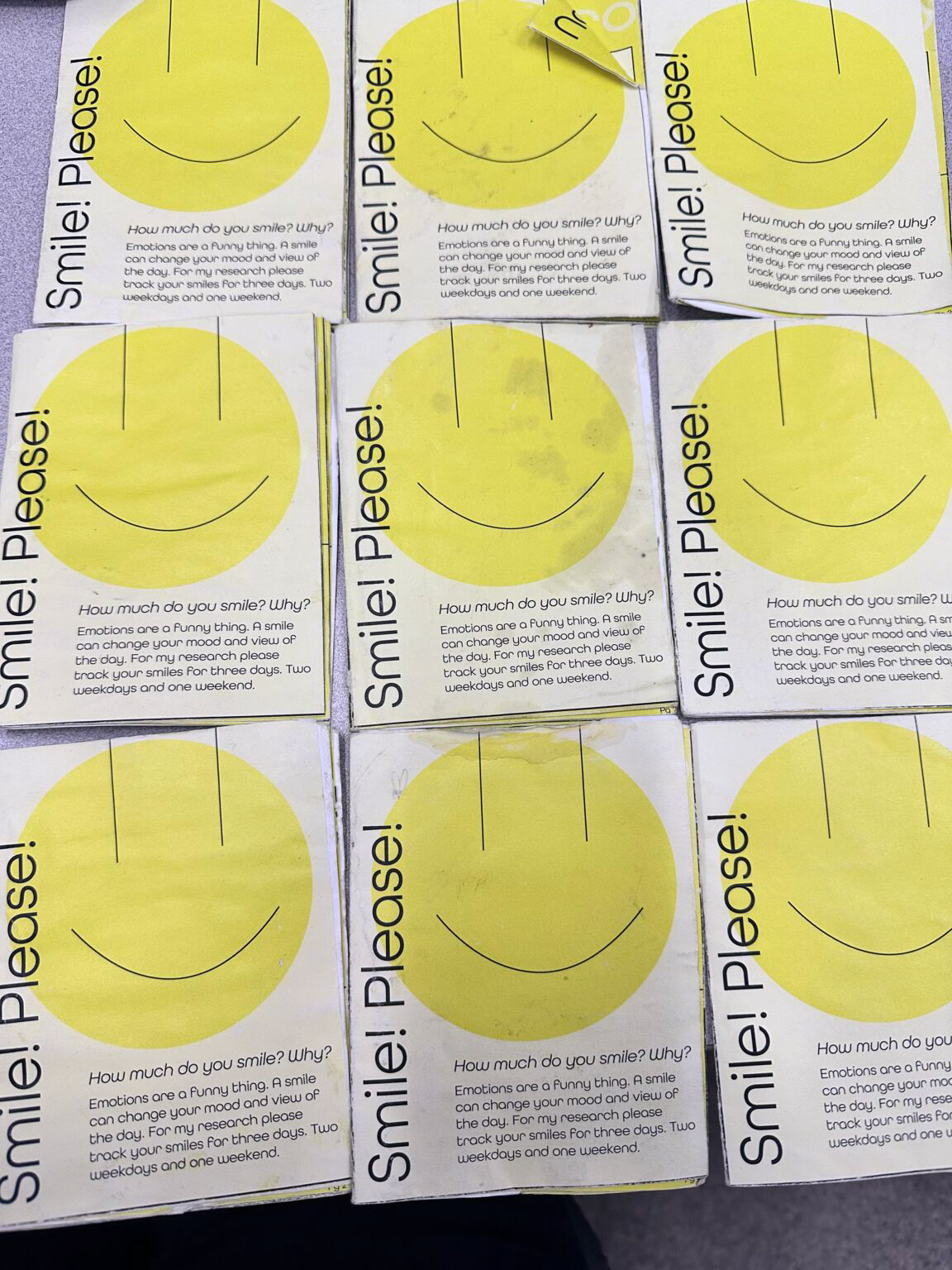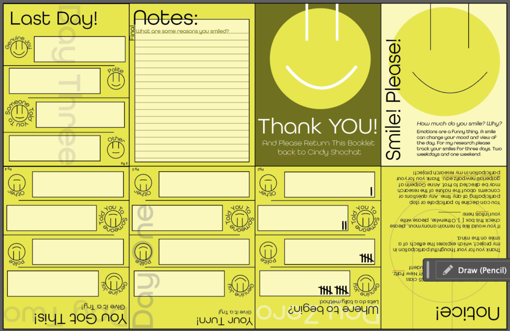 I created a tally booklet for people to record their smiles on. I wanted a party of people to track their smiles, bringing awareness to them about smiling and seeing what comes of it. I selected even amount of women to men to also see the change gender causes.