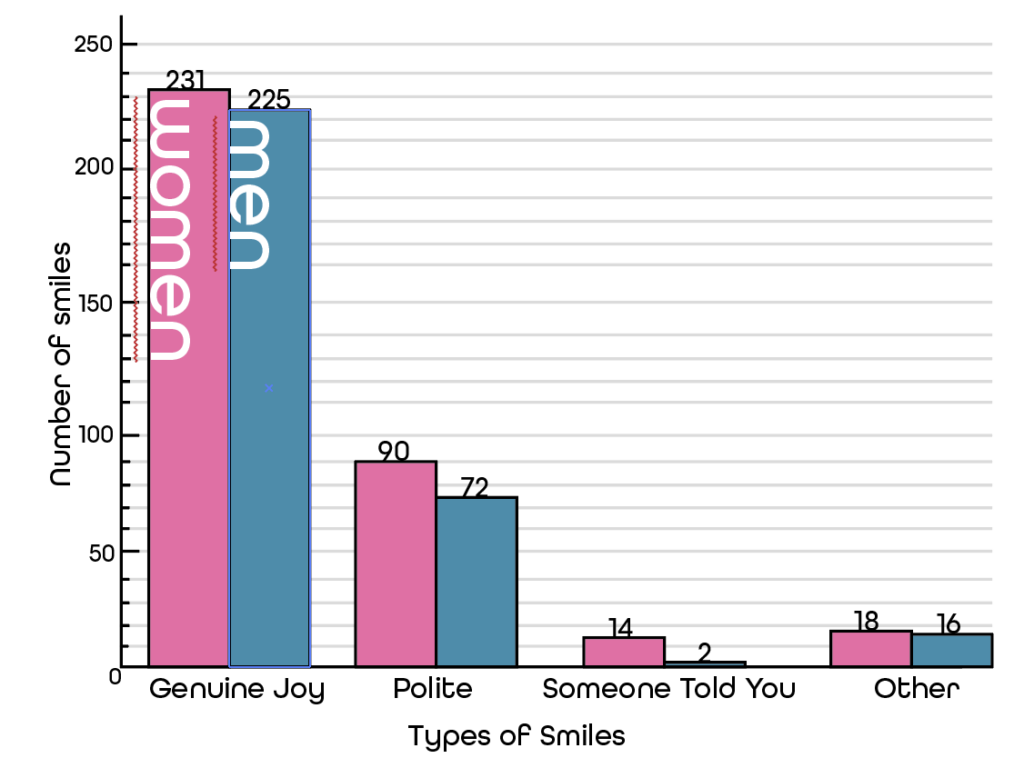 Here is the data visualized. I had them fill out different marks for different types of smiles. For the genuine, the difference is not as much as what i thought it would be however keeping in mind there is four women to the five men I got its still apparent to see. The one I expected the most was the someone told you to slot which as you can see is 14 to 2. There is also a good gap for the polite smiles as well.
